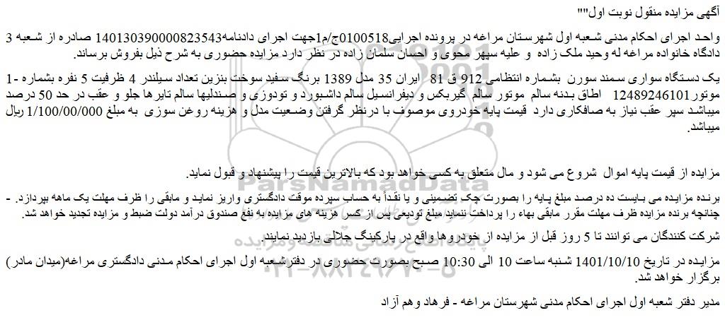 مزایده در تاریخ 1401/10/10 شنبه ساعت 10 الی 10:30 صبح بصورت حضوری در دفترشعبه اول اجرای احکام مدنی دادگستری مراغه(میدان مادر) برگزار خواهد شد.