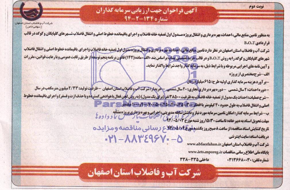 شرکت آب و فاضلاب استان اصفهان در نظر دارد تامین منابع مالی، احداث، بهره برداری و انتقال پروژه مدول اول تصفیه خانه فاضلاب و اجرای باقیمانده خطوط اصلی و انتقال فاضلاب شهرهای گلپایگان و گوگد در قالب قراردادی B.O.T و در قالب خرید تضمینی پساب بر اساس بند الف ماده 142 قانون برنامه پنجم توسعه از طریق رقابت عمومی و با رعایت قوانین، مقررات و آیین نامه های اجرایی مربوطه با شرایط ذیل به سرمایه گذار واجد شرایط واگذار نماید.