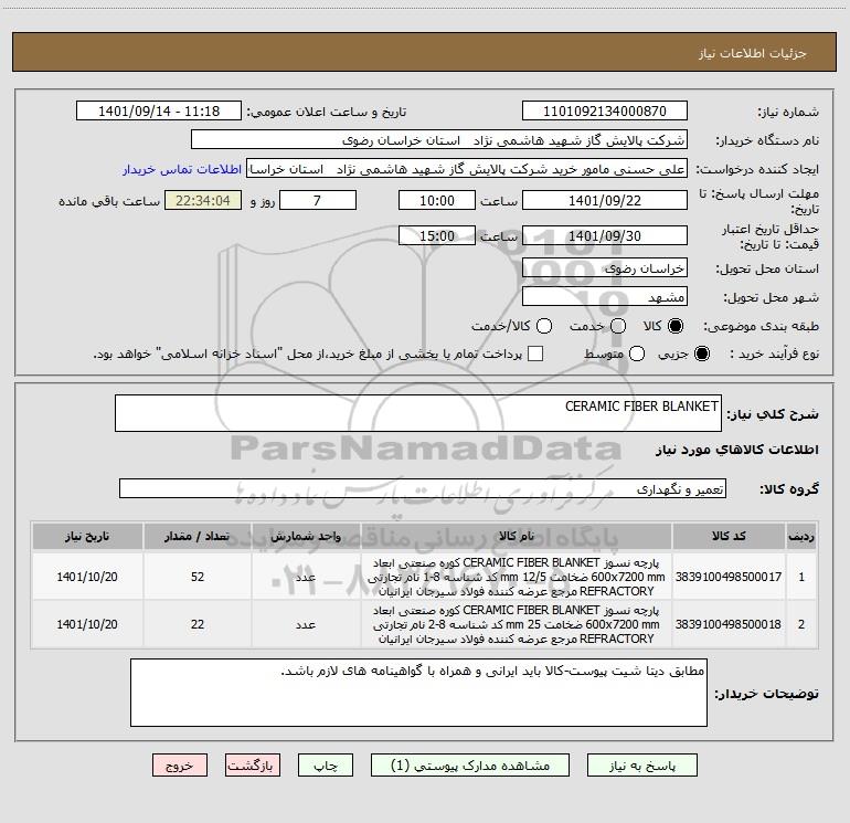 شرح کلی نیاز: CERAMIC FIBER BLANKET