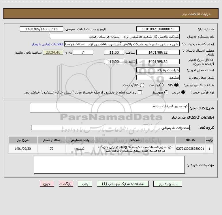 نام دستگاه خریدار:شرکت پالایش گاز شهید هاشمی نژاد استان خراسان رضوی
