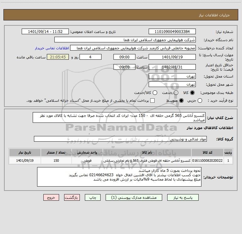 شرح کلی نیاز: کنسرو آناناس 565 گرمی حلقه ای - 150 عدد- ایران کد انتخاب شده صرفا جهت تشابه با کالای مورد نظر میباشد