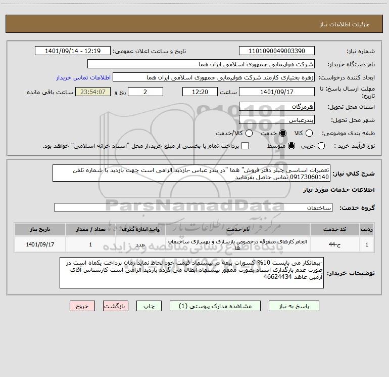 شرح کلی نیاز: تعمیرات اساسی چیلر دفتر فروش" هما "در بندر عباس -بازدید الزامی است جهت بازدید با شماره تلفن 09173060140 تماس حاصل بفرمایید