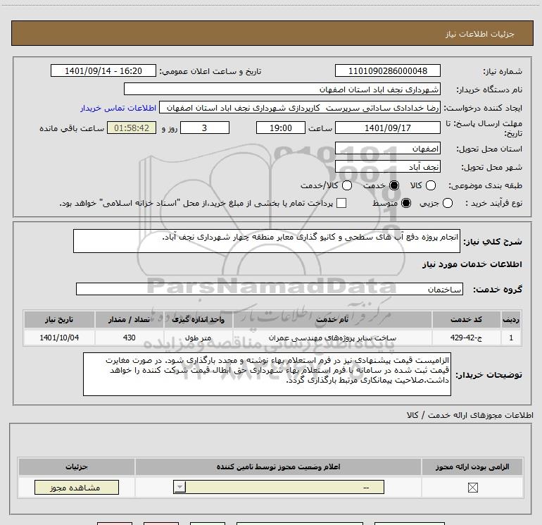 شرح کلی نیاز: انجام پروژه دفع آب های سطحی و کانیو گذاری معابر منطقه چهار شهرداری نجف آباد.