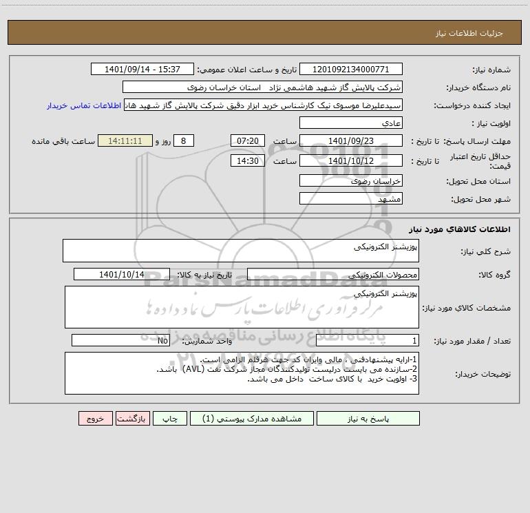 نام دستگاه خریدار:شرکت پالایش گاز شهید هاشمی نژاد استان خراسان رضوی