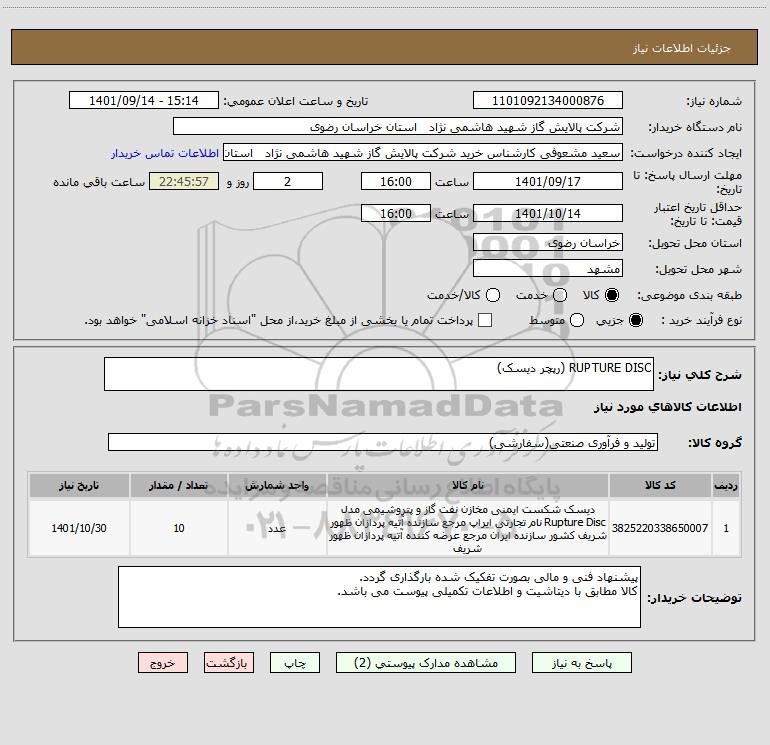 نام دستگاه خریدار:شرکت پالایش گاز شهید هاشمی نژاد استان خراسان رضوی