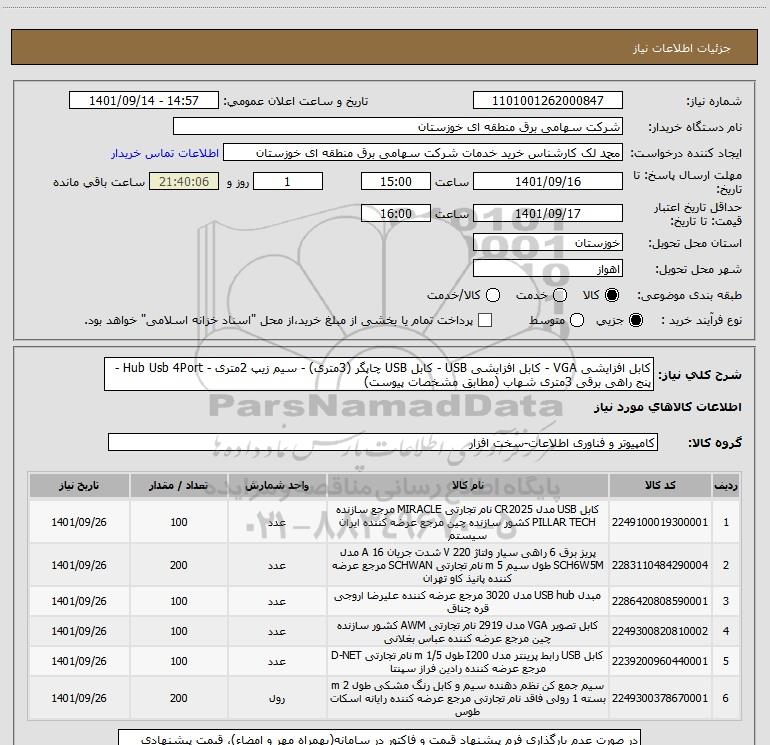 شرح کلی نیاز: کابل افزایشی VGA - کابل افزایشی USB - کابل USB چاپگر (3متری) - سیم زیپ 2متری - Hub Usb 4Port - پنج راهی برقی 3متری شهاب (مطابق مشخصات پیوست)