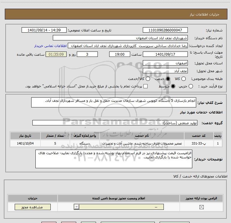 شرح کلی نیاز: انجام بازسازی 5 دستگاه اتوبوس شهری سازمان مدیریت حمل و نقل بار و مسافر شهرداری نجف آباد.