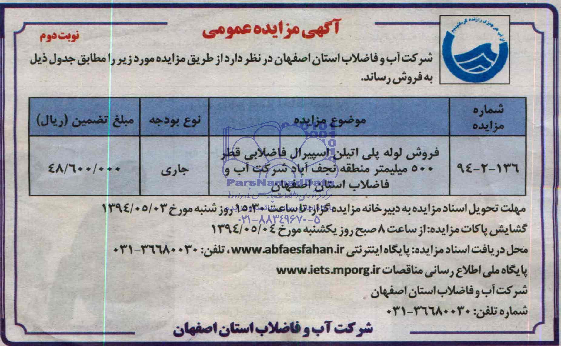 شرکت آب و فاضلاب استان اصفهان در نظر دارد از طریق مزایده مورد زیر را مطابق جدول ذیل به فروش رساند.