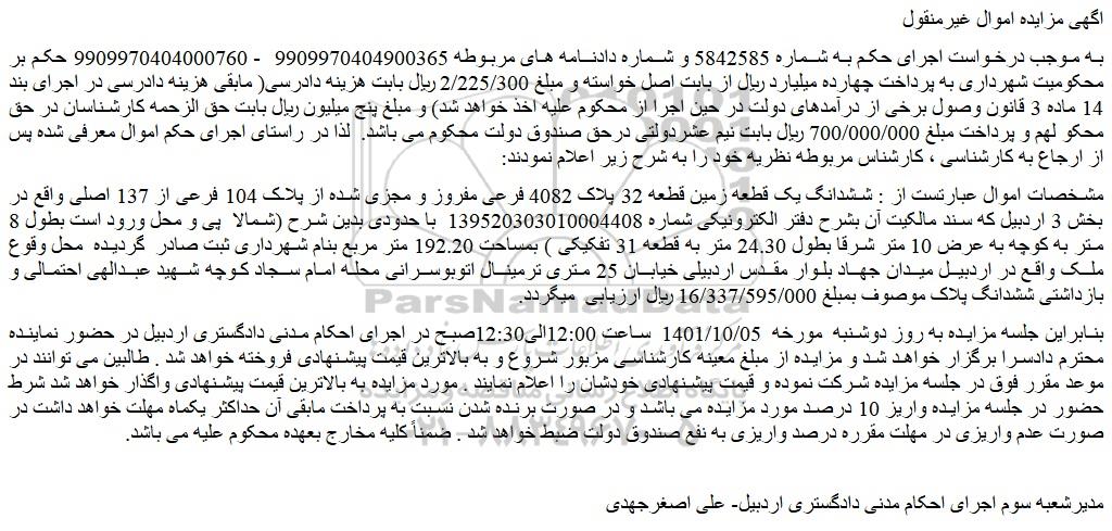مشخصات اموال عبارتست از : ششدانگ یک قطعه زمین قطعه 32 پلاک 4082 فرعی مفروز و مجزی شده از پلاک 104 فرعی از 137 اصلی واقع در بخش 3 اردبیل که سند مالکیت آن بشرح دفتر الکترونیکی شماره 139520303010004408 با حدودی بدین شرح (شمالا پی و محل ورود است بطول 8 متر به کوچه به عرض 10 متر شرقا بطول 24.30 متر به قطعه 31 تفکیکی ) بمساحت 192.20 متر مربع بنام شهرداری ثبت صادر گردیده محل وقوع ملک واقع در اردبیل میدان جهاد بلوار مقدس اردبیلی خیابان 25 متری ترمینال اتوبوسرانی محله امام سجاد کوچه شهید عبدالهی احتمالی و بازداشتی ششدانگ پلاک موصوف بمبلغ 16/337/595/000 ریال ارزیابی میگردد.