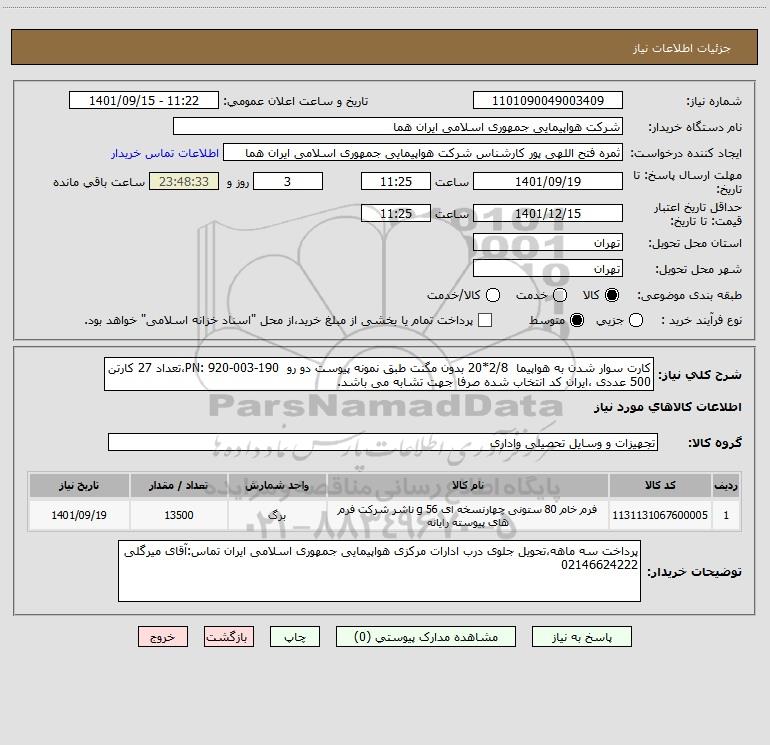 شرح کلی نیاز: کارت سوار شدن به هواپیما 2/8*20 بدون مگنت طبق نمونه پیوست دو رو PN: 920-003-190،تعداد 27 کارتن 500 عددی ،ایران کد انتخاب شده صرفا جهت تشابه می باشد.