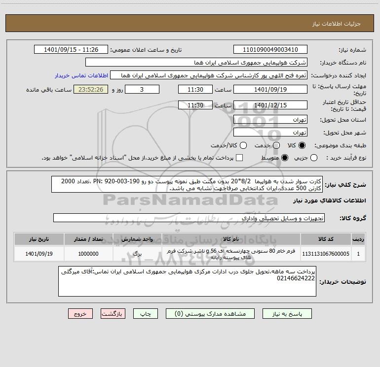 شرح کلی نیاز: کارت سوار شدن به هواپیما 8/2*20 بدون مگنت طبق نمونه پیوست دو رو PN: 920-003-190 ،تعداد 2000 کارتن 500 عددی،ایران کدانتخابی صرفاجهت تشابه می باشد.