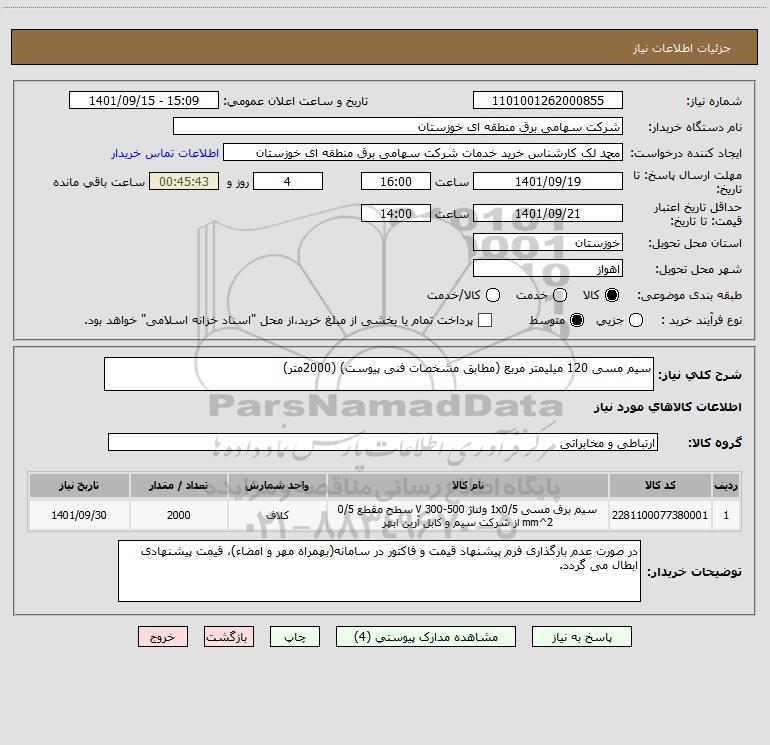 استعلام سیم مسی 120 میلیمتر مربع (مطابق مشخصات فنی پیوست) (2000متر), استعلام سیم مسی 120 میلیمتر مربع (مطابق مشخصات فنی پیوست) (2000متر)