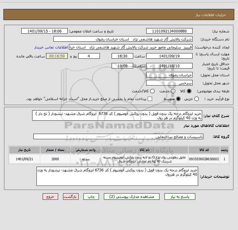 شرح کلی نیاز: خرید ایزوگام درجه یک بدون فویل ( بدون روکش آلومنیوم ) کد 6736 ایزوگام شرق مشهد- تیشودار ( نخ دار ) به وزن 40 کیلوگرم در هر رول