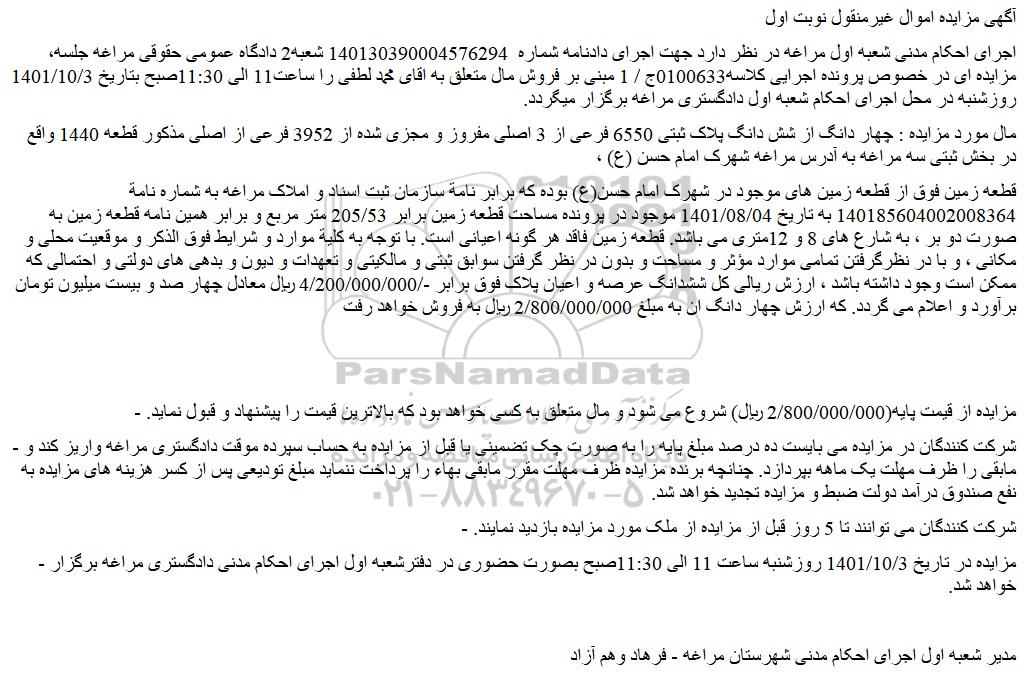 مزایده فروش چهار دانگ از شش دانگ پلاک ثبتی 6550 فرعی از 3 اصلی, مزایده فروش چهار دانگ از شش دانگ پلاک ثبتی 6550 فرعی از 3 اصلی