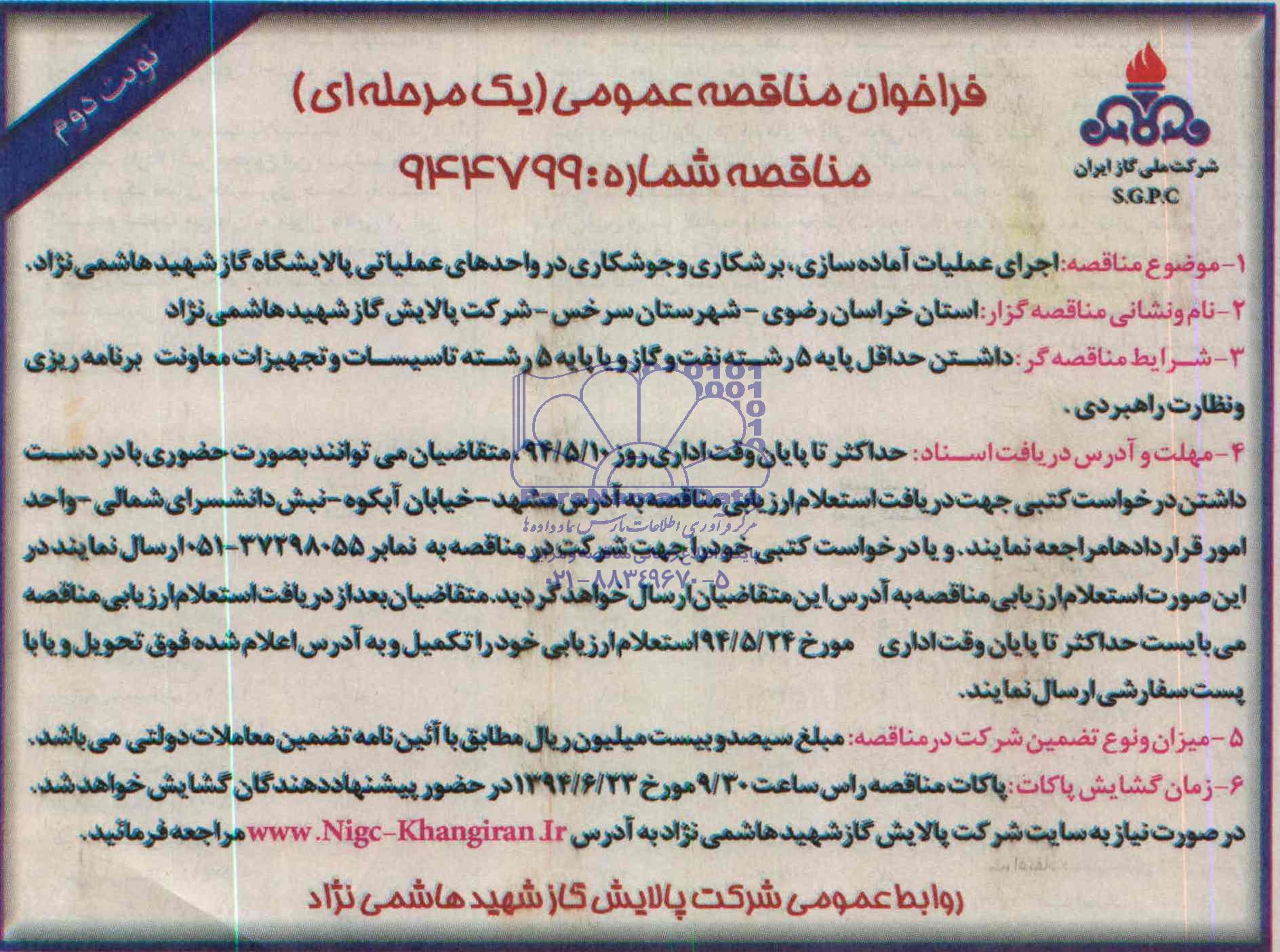 نام و نشانی مناقصه گزار: استان خراسان رضوی، شهرستان سرخس، شرکت پالایش گاز شهید هاشمی نژاد