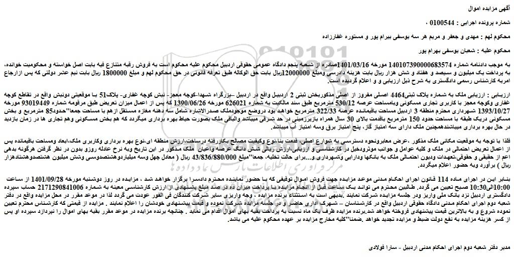 بنابر این در اجرای ماده 114 قانون اجرای احکام مدنی موعد مزایده جهت فروش اموال توقیفی که با حضور نماینده محترم دادسرا برگزار خواهد شد ، مزایده در روز دوشنبه مورخه 1401/09/28 از ساعت 10:00الی10:30 صبح تعیین می گردد. طالبین محترم می تواند یک ساعت قبل از انجام مزایده با پرداخت میزان ده در صد مبلغ پشنهادی از ارزش کارشناسی معینه به شماره 2171290841006 حساب سپرده دادگستری اردبیل نزد بانک ملی واریز ودر جلسه مزایده شرکت نمایند .بدیهی است به استثناء برنده مزایده ، وجه واریزی سایر شرکت کنندگان فی الفور عودت می گردد لذا در موعد مقرر در محل مزایده واقع در دفتر شعبه دوم اجرای احکام مدنی دادگاه حقوقی اردبیل واقع در کارشناسان – شهرک اداری حاضر و در جلسه مزایده شرکت نموده و قیمت پیشنهادی خودشان را اعلام نمایند . مزایده از قیمتی که کارشناس محترم تعیین نموده شروع و به بالاترین قیمت پیشنهادی فروخته خواهد شد.برنده مزایده ظرف یک ماه نسبت به پرداخت بقیه بهای اموال اقدام می نماید . چنانچه برنده مزایده در موعد مقرر بقیه بهای اموال را نپردازد سپرده او پس از کسر هزینه مزایده به نفع دولت ضبط و مزایده تجدید خواهد .ضمنا"کلیه مخارج مزایده بر عهده محکوم علیه می باشد.