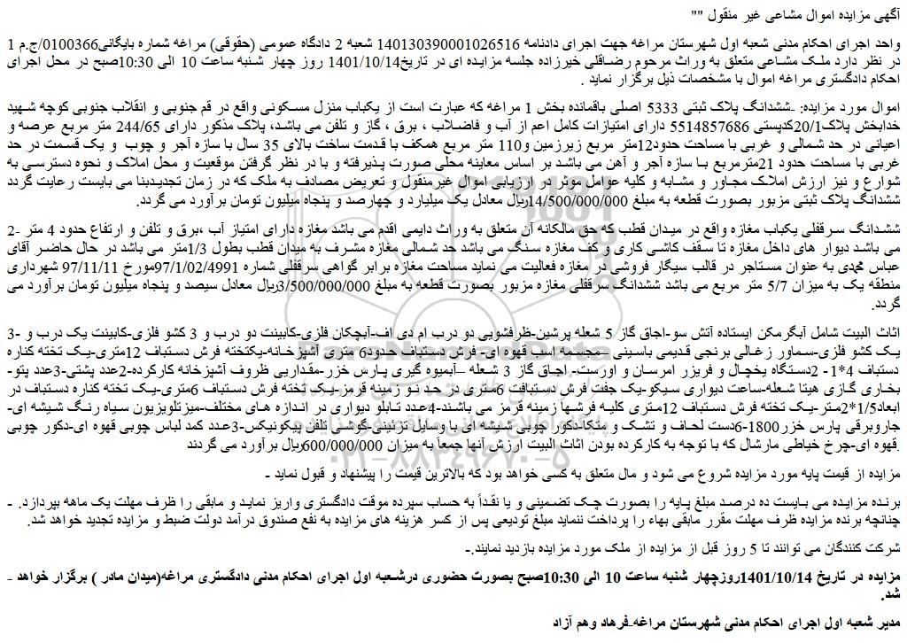 - مزایده در تاریخ 1401/10/14روزچهار شنبه ساعت 10 الی 10:30صبح بصورت حضوری درشعبه اول اجرای احکام مدنی دادگستری مراغه(میدان مادر ) برگزار خواهد شد.