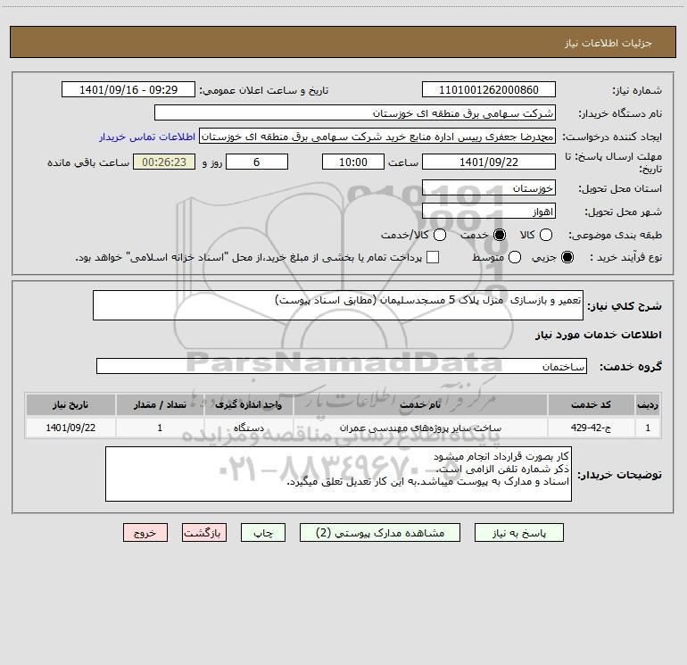 شرح کلی نیاز: تعمیر و بازسازی منزل پلاک 5 مسجدسلیمان (مطابق اسناد پیوست)