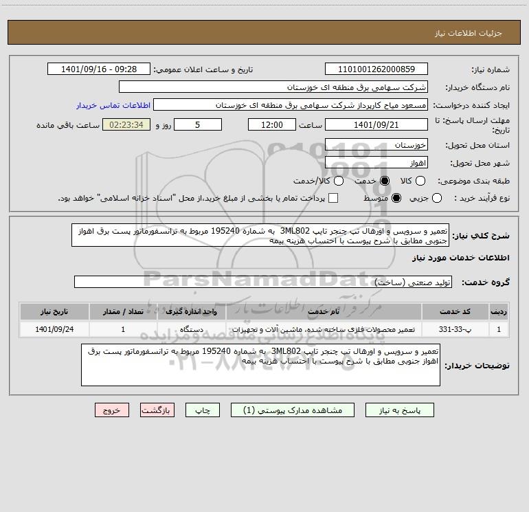 شرح کلی نیاز: تعمیر و سرویس و اورهال تپ چنجر تایپ 3ML802 به شماره 195240 مربوط به ترانسفورماتور پست برق اهواز جنوبی مطابق با شرح پیوست با احتساب هزینه بیمه
