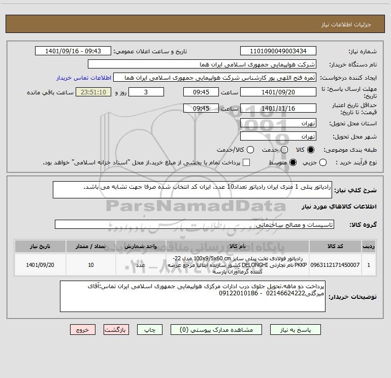 شرح کلی نیاز: رادیاتور پنلی 1 متری ایران رادیاتور تعداد10 عدد، ایران کد انتخاب شده صرفا جهت تشابه می باشد.