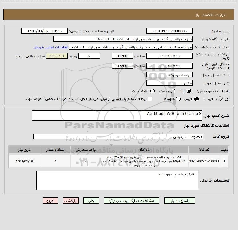 شرح کلی نیاز: Ag Titrode WOC with Coating S