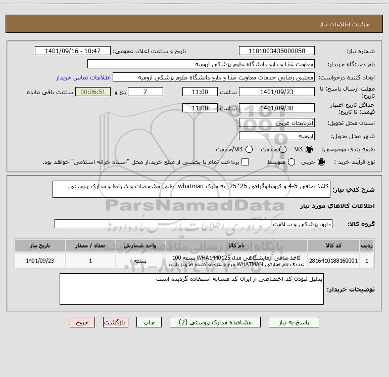 شرح کلی نیاز: کاغذ صافی 5-4 و کروماتوگرافی 25*25 به مارک whatman طبق مشخصات و شرایط و مدارک پیوستی