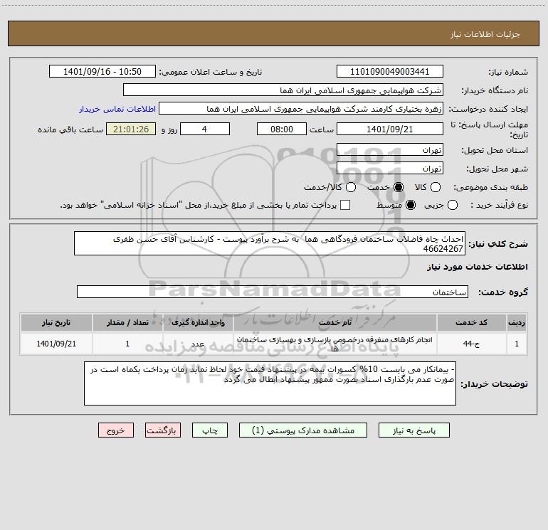 شرح کلی نیاز: احداث چاه فاضلاب ساختمان فرودگاهی هما به شرح برآورد پیوست - کارشناس آقای حسن ظفری 46624267