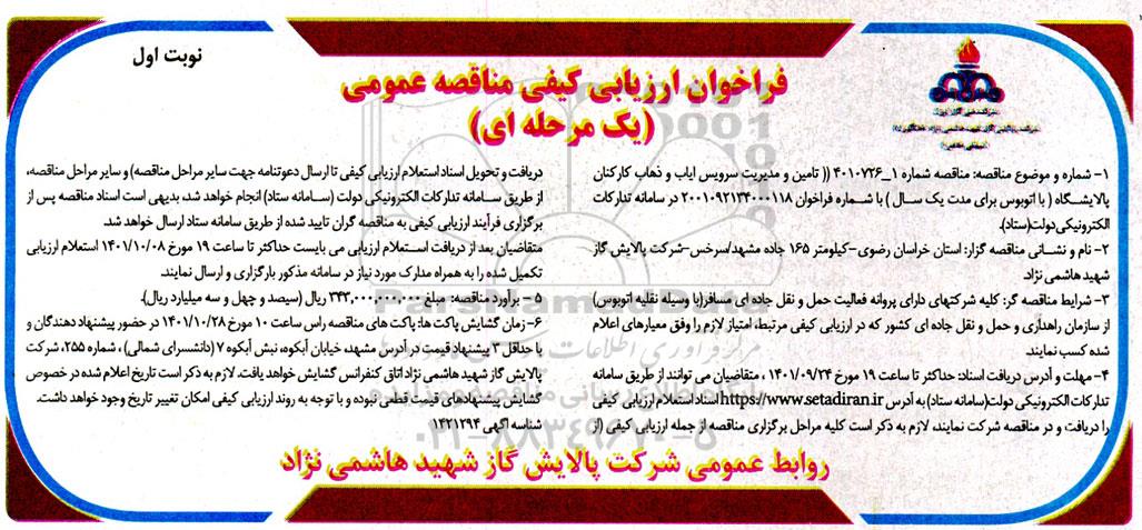 1- شماره و موضوع مناقصه: مناقصه شماره 1 -  4010726 (تامین و مدیریت سرویس ایاب و ذهاب کارکنان پالایشگاه (با اتوبوس برای مدت یک سال) با شماره فراخوان 2001092134000118 در سامانه تدارکات الکترونیکی دولت ستاد
