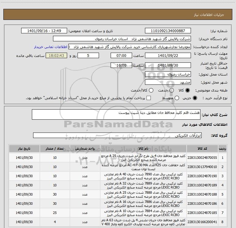 نام دستگاه خریدار:شرکت پالایش گاز شهید هاشمی نژاد استان خراسان رضوی