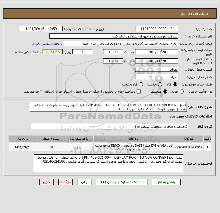 شرح کلی نیاز: تبدیل PN: 409-001-004 DISPLAY PORT TO VGA CONVERTER) طبق تصویر پیوست -ایران کد انتخابی به دلیل موجود نبودن ایران کد دقیق می باشد )
