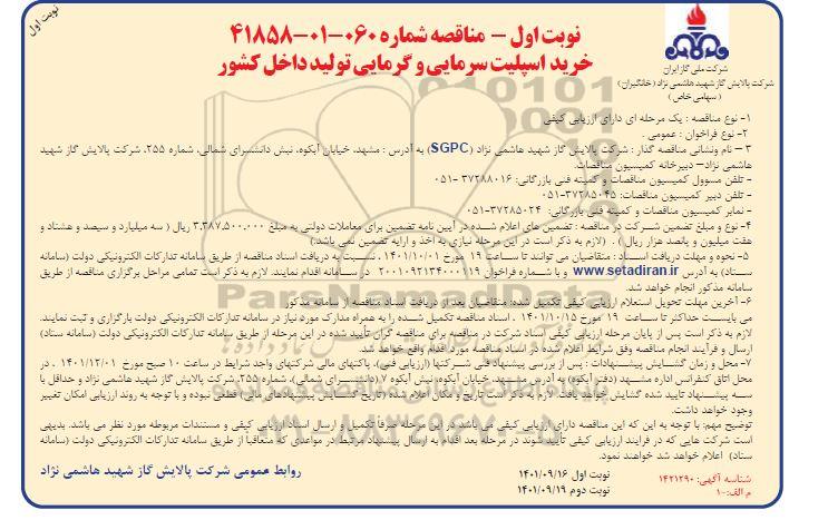 نام و نشانی مناقصه گزار: شرکت پالایش گاز شهید هاشمی نژاد SGPC به آدرس: مشهد، خیابان آبکوه نبش دانشسرای شمالی شماره 255 شرکت پالایش گاز شهید هاشمی نژاد دبیرخانه کمیسیون مناقصات