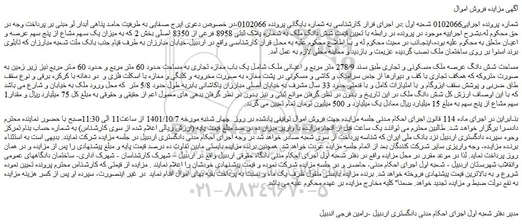 شماره پرونده اجرایی0102066 شعبه اول :در اجرای قرار کارشناسی به شماره بایگانی پرونده 0102066،در خصوص دعوی ایرج صفایی به طرفیت حامد پناهی آبدار لو مبنی بر پرداخت وجه در حق محکوم له،بشرح اجراییه موجود در پرونده در رابطه با تعیین قیمت شش دانگ ملک به شماره پلاک ثبتی 8958 فرعی از 8350 اصلی بخش 2 که به میزان یک سهم مشاع از پنج سهم عرصه و اعیان متعلق به محکوم علیه بوده،اینجانب در معیت محکوم له و با اطلاع محکوم علیه به محل قرار کارشناسی واقع در اردبیل-خیابان مبارزان به طرف قیام جنب بانک ملت شعبه مبارزان که تابلوی برند اسنوا بر روی ساختمان ملک نصب گردیده عزیمت و بازدید و معاینه محلی لازم به عمل آمد.