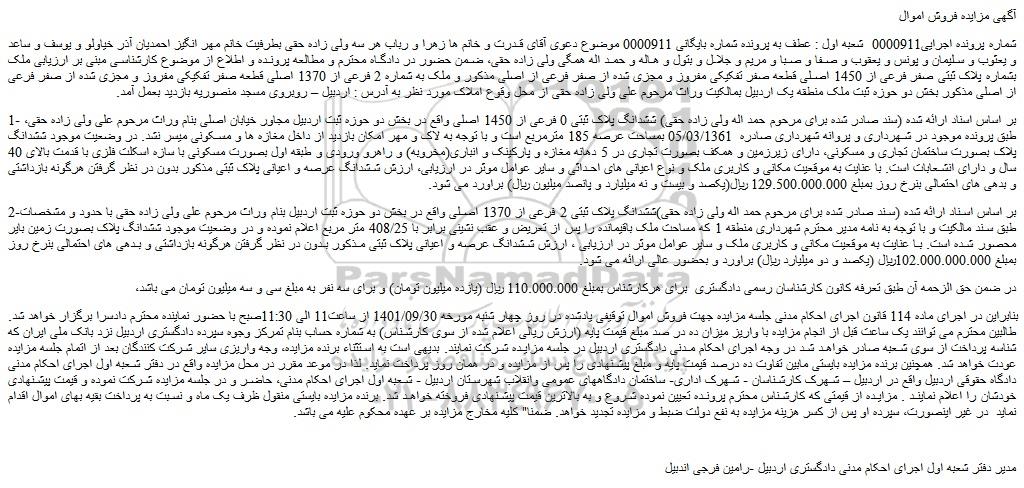 شماره پرونده اجرایی0000911 شعبه اول : عطف به پرونده شماره بایگانی 0000911 موضوع دعوی آقای قدرت و خانم ها زهرا و رباب هر سه ولی زاده حقی بطرفیت خانم مهر انگیز احمدیان آذر خیاولو و یوسف و ساعد و یعثوب و سلیمان و پونس و یعقوب و صفا و صبا و مریم و جلال و بتول و هاله و حمد اله همگی ولی زاده حقی، ضمن حضور در دادگاه محترم و مطالعه پرونده و اطلاع از موضوع کارشناسی مبنی بر ارزیابی ملک بشماره پلاک ثبتی صفر فرعی از 1450 اصلی قطعه صفر تفکیکی مفروز و مجزی شده از صفر فرعی از اصلی مذکور و ملک به شماره 2 فرعی از 1370 اصلی قطعه صفر تفکیکی مفروز و مجزی شده از صفر فرعی از اصلی مذکور بخش دو حوزه ثبت ملک منطقه یک اردبیل بمالکیت وراث مرحوم علی ولی زاده حقی از محل وقوع املاک مورد نظر به آدرس : اردبیل – روبروی مسجد منصوریه بازدید بعمل آمد.