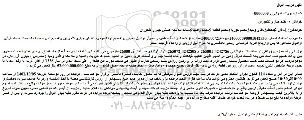 ،به موجب دادنامه شماره 140007390001042530مورخه1400/07/21صادره از شعبه 5 دادگاه عمومی حقوقی اردبیل ، مبنی برتقسیم ترکه مرحوم داداش جباری کلخوران وتقسیم ثمن حاصله به نسبت حصه طرفین ازاموال مشاعی که پس ازارجاع امربه کارشناس رسمی دادگستری به شرح ذیل ارزیابی و واعلام گردیده است.