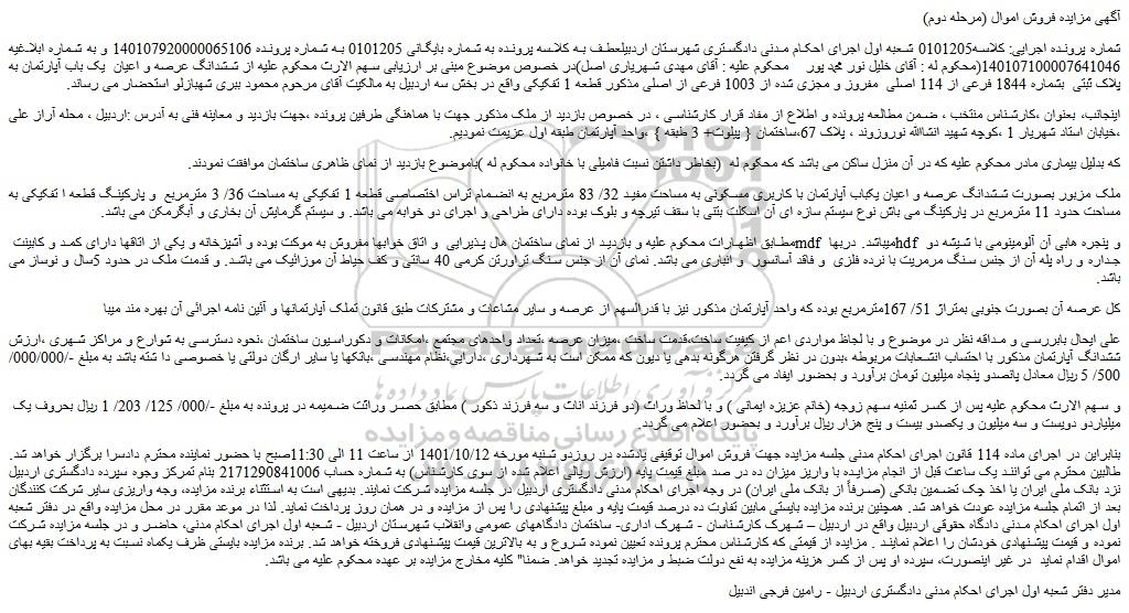شماره پرونده اجرایی: کلاسه0101205 شعبه اول اجرای احکام مدنی دادگستری شهرستان اردبیلعطف به کلاسه پرونده به شماره بایگانی 0101205 به شماره پرونده 140107920000065106 و به شماره ابلاغیه 140107100007641046(محکوم له : آقای خلیل نور محمد پور    محکوم علیه : آقای مهدی شهریاری اصل)در خصوص موضوع مبنی بر ارزیابی سهم الارث محکوم علیه از ششدانگ عرصه و اعیان  یک باب آپارتمان به پلاک ثبتی  بشماره 1844 فرعی از 114 اصلی  مفروز و مجزی شده از 1003 فرعی از اصلی مذکور قطعه 1 تفکیکی واقع در بخش سه اردبیل به مالکیت آقای مرحوم محمود ببری شهبازلو استحضار می رساند.