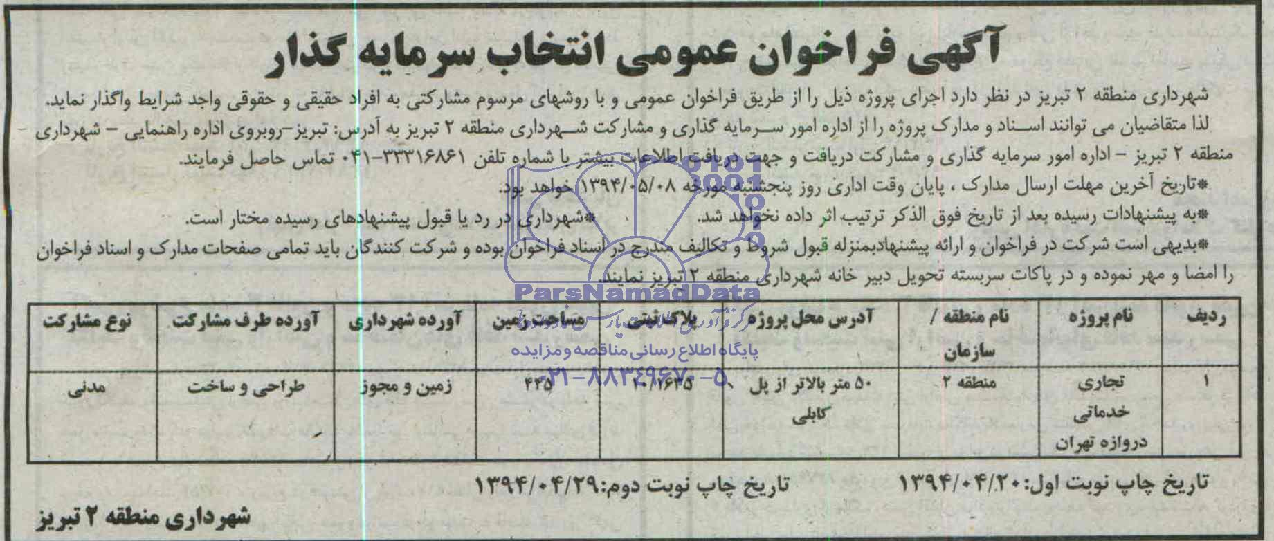 شهرداری منطقه 2 تبریز در نظر دارد اجرای پروژه ذیل را از طریق فراخوان عمومی و با روشهای مرسوم مشارکتی به افراد حقیقی و حقوقی واجد شرایط واگذار نماید. لذا متقاضیان می توانند اسناد و مدارک پروژه را از اداره امور سرمایه گذاری و مشارکت شهرداری منطقه 2 تبریز به آدرس: تبریز، روبروی اداره راهنمایی، شهرداری منطقه 2 تبریز، اداره امور سرمایه گذاری و مشارکت دریافت و جهت دریافت اطلاعات بیشتر با شماره تلفن 33316861-041 تماس حاصل فرمایند.