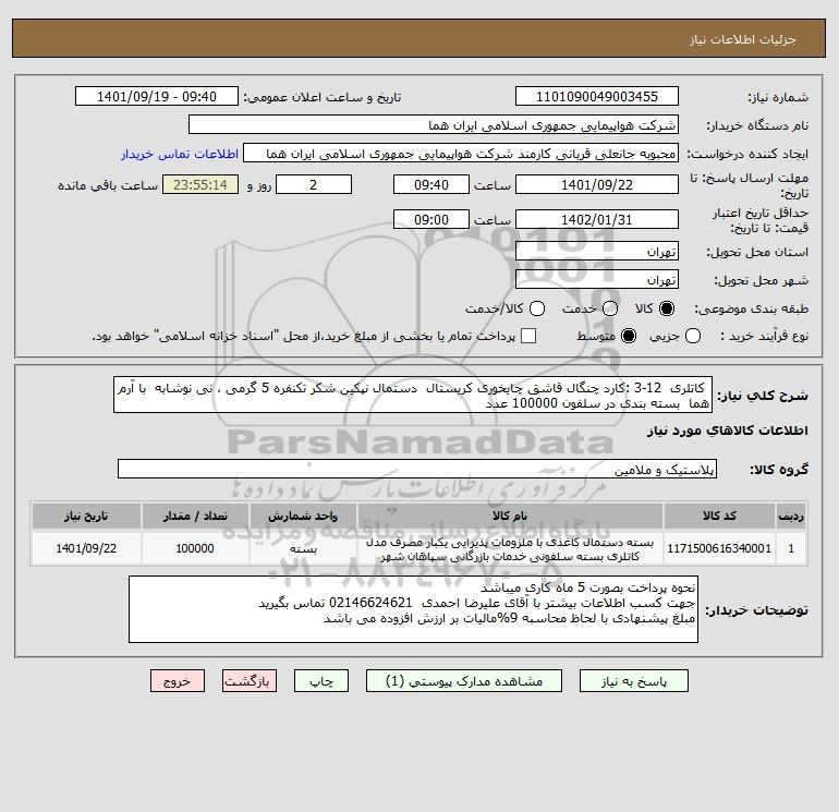 شرح کلی نیاز: کاتلری 12-3 :کارد چنگال قاشق چایخوری کریستال دستمال نپکین شکر تکنفره 5 گرمی ، نی نوشابه با آرم هما بسته بندی در سلفون 100000 عدد