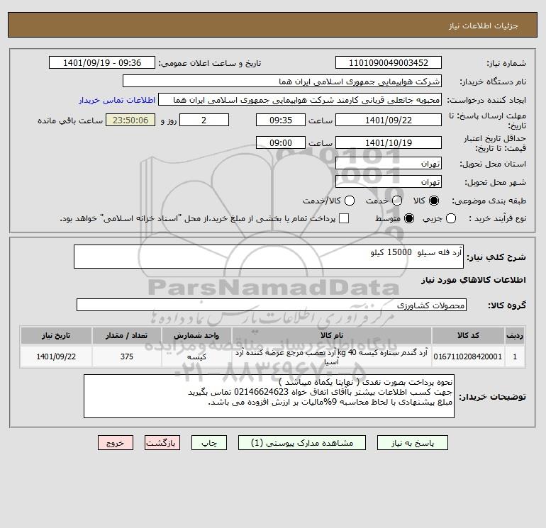 شرح کلی نیاز: آرد فله سیلو 15000 کیلو
