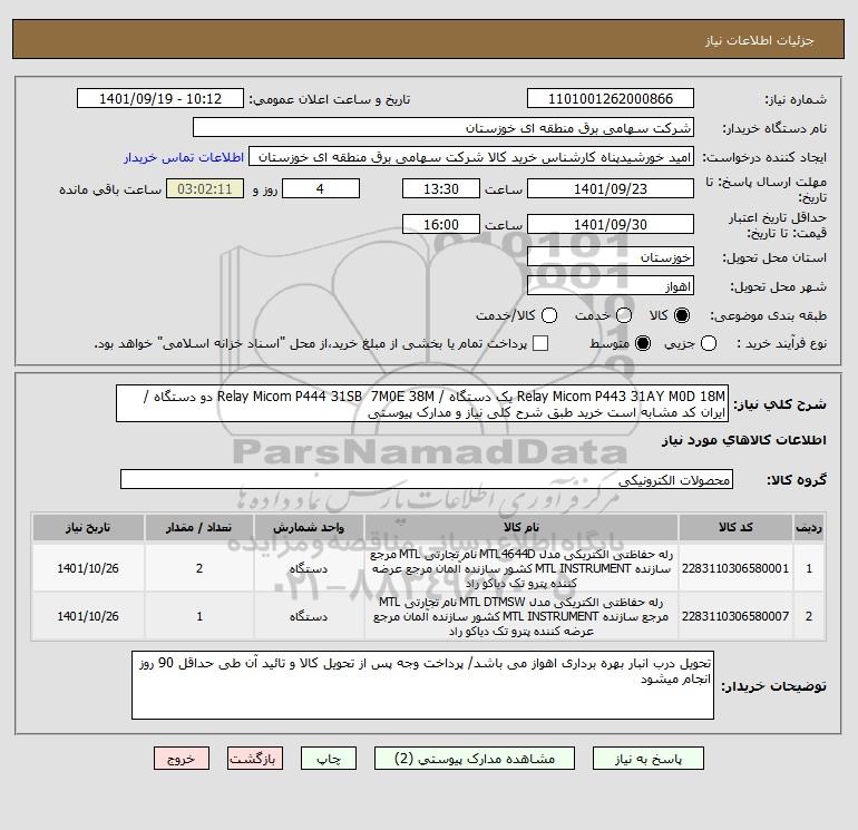 شرح کلی نیاز: Relay Micom P443 31AY M0D 18M یک دستگاه / Relay Micom P444 31SB 7M0E 38M دو دستگاه / ایران کد مشابه است خرید طبق شرح کلی نیاز و مدارک پیوستی