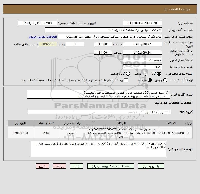 شرح کلی نیاز: سیم مسی 120 میلیمتر مربع (مطابق مشخصات فنی پیوست) (سیمها می بایست بر روی قرقره های 500 کیلویی پیچانده باشند)