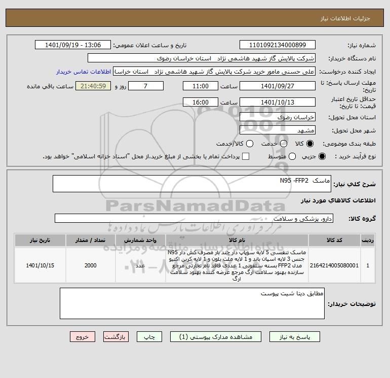نام دستگاه خریدار:شرکت پالایش گاز شهید هاشمی نژاد استان خراسان رضوی