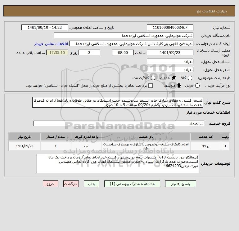 شرح کلی نیاز: تسمه کشی و مقاوم سازی چادر استخر سرپوشیده جهت استحکام در مقابل طوفان و باد(هما)، ایران کدصرفا جهت تشابه میباشد.بازدید یکشنبه09/20 ساعت 9 تا 10 صبح