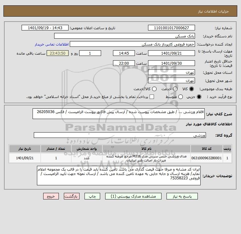 شرح کلی نیاز: اقلام ورزشی ... / طبق مشخصات پیوست شده / ارسال پیش فاکتور پیوست الزامیست / فکس 26205036
