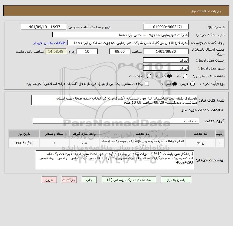 شرح کلی نیاز: بازسازی طبقه دوم ساختمان انبار مواد شیمیایی(هما)،ایران کد انتخاب شده صرفا جهت تشابه میباشد.بازدیدیکشنبه 09/20 ساعت 9تا 10 صبح