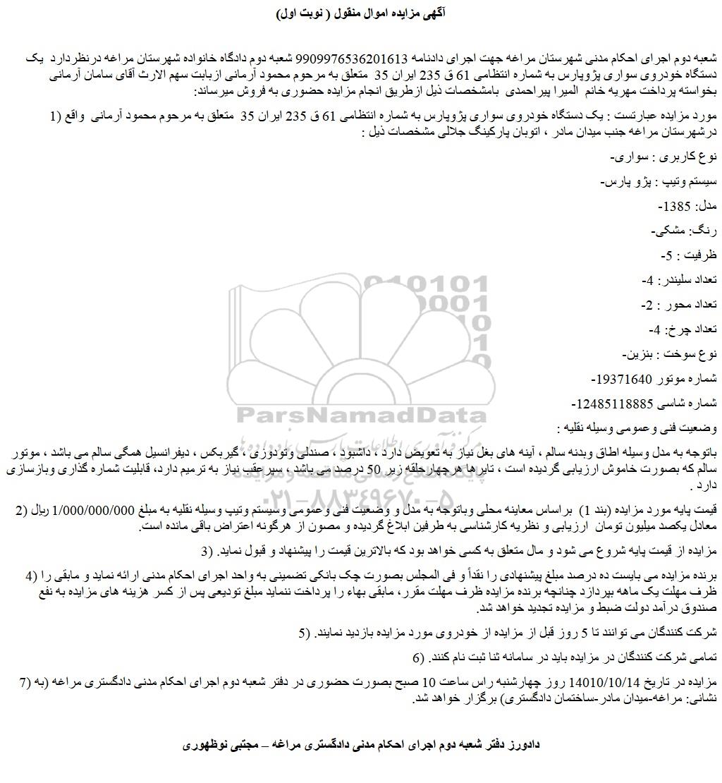 شعبه دوم اجرای احکام مدنی شهرستان مراغه جهت اجرای دادنامه 9909976536201613 شعبه دوم دادگاه خانواده شهرستان مراغه درنظردارد  یک دستگاه خودروی سواری پژوپارس به شماره انتظامی 61 ق 235 ایران 35  متعلق به مرحوم محمود آرمانی ازبابت سهم الارث آقای سامان آرمانی  بخواسته پرداخت مهریه خانم  المیرا پیراحمدی  بامشخصات ذیل ازطریق انجام مزایده حضوری به فروش میرساند: