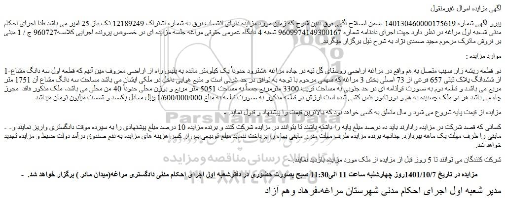 پیرو آگهی شماره 140130460000175619 ضمن اصلاح آگهی فوق بدین شرح که زمین مورد مزایده دارای انشعاب برق به شماره اشتراک 12189249 تک فاز 25 آمپر می باشد فلذا اجرای احکام مدنی شعبه اول مراغه در نظر دارد جهت اجرای دادنامه شماره 9609974149300167 شعبه 4 دادگاه عمومی حقوقی مراغه جلسه مزایده ای در خصوص پرونده اجرایی کلاسه960727 ج / 1 مبنی بر فروش ماترک مرحوم مجید صمدی نژاد به شرح ذیل برگزار میگردد.