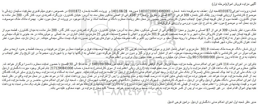 مزایده فروش ملک بشماره 309 فرعی از 87 اصلی و مفروز و مجزا از 96 فرعی از اصلی , مزایده فروش ملک بشماره 309 فرعی از 87 اصلی و مفروز و مجزا از 96 فرعی از اصلی