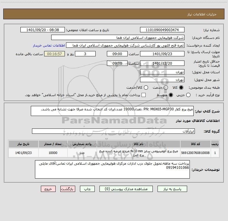 شرح کلی نیاز: میخ پرچ کلار PN: M6X65-MGP30 ،تعداد10000 عدد،ایران کد انتخاب شده صرفا جهت تشایه می باشد.
