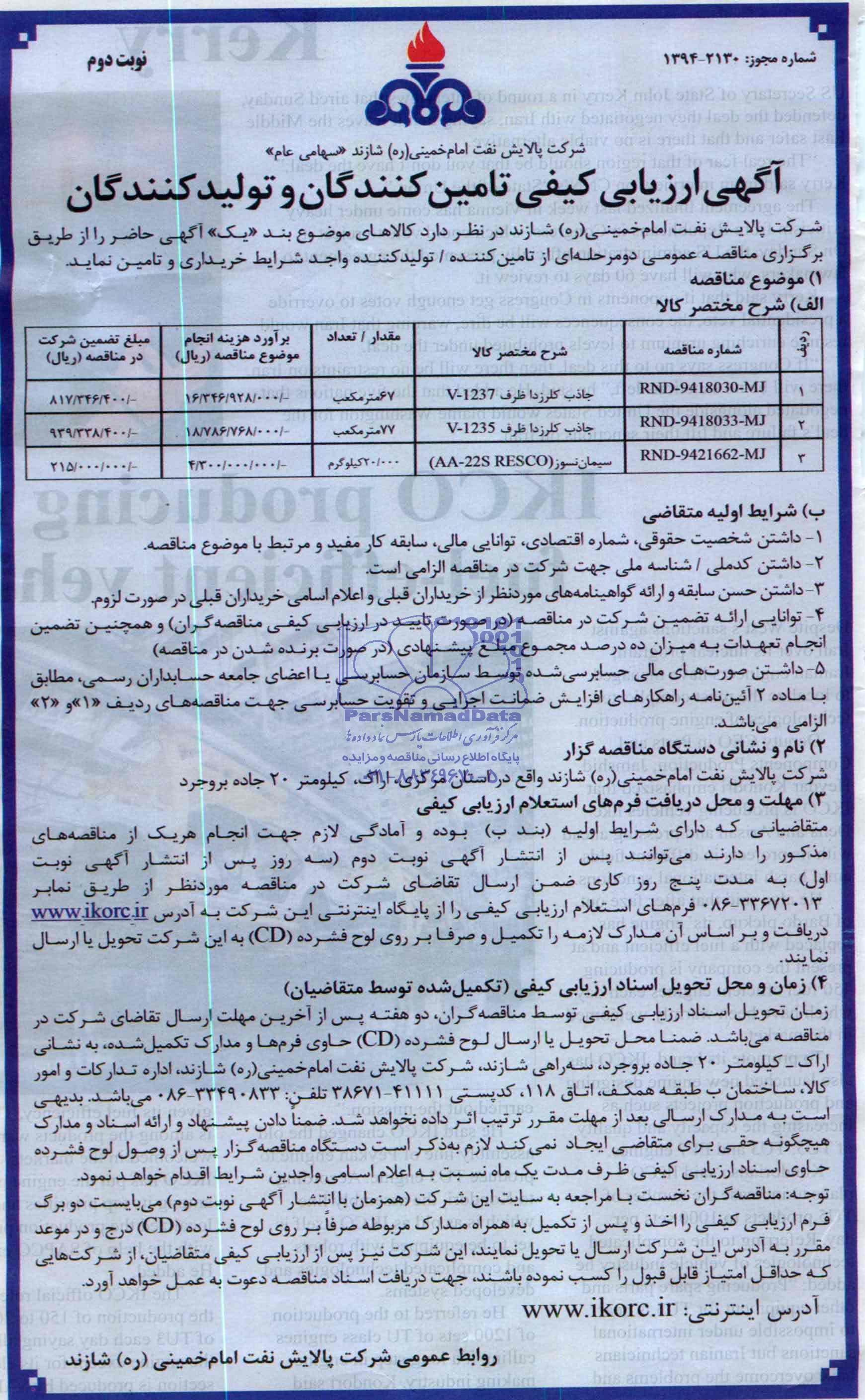 متقاضیانی که دارای شرایط اولیه بند ب بوده و آمادگی لازم جهت انجام مناقصه مذکور را دارند می توانند پس از انتشار اگهی نوبت دوم (سه روز پس از انتشار آگهی نوبت اول) به مدت پنج روز کاری ضمن ارسال تقاضای شرکت در مناقصه مورد نظر از طریق نمابر 33672013 - 086 فرم های استعلام ارزیابی کیفی را از پایگاه اینترنتی این شرکت به آدرس WWW.IKORC.IR دریافت و بر اساس آن مدارک لازمه را تکمیل و صرفا برروی (لوح فشرده ) به این شرکت تحویل یا ارسال نمایند