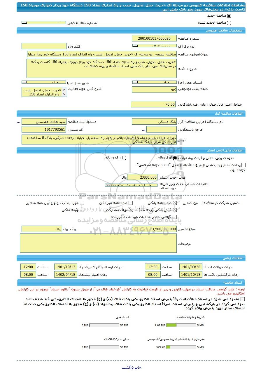 عنوان/موضوع مناقصه | مناقصه عمومی دو مرحله ای «خرید، حمل، تحویل، نصب و راه اندازی تعداد 150 دستگاه خود پرداز دیواری بهمراه 150 کاست یدک» در محلهای مورد نظر بانک طبق اس | ||